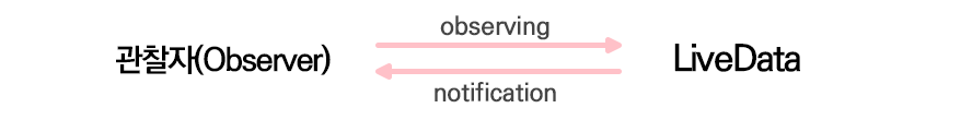 라이브데이터에 저장된 값이 변경될 때, 라이브데이터는 Observer 객체에 알리게 되고(notification), Observe를 통해 새로 바뀐 newValue값을 관찰하게 된다. 이를 옵저버패턴(Obeserver Pattern)이라고 한다.